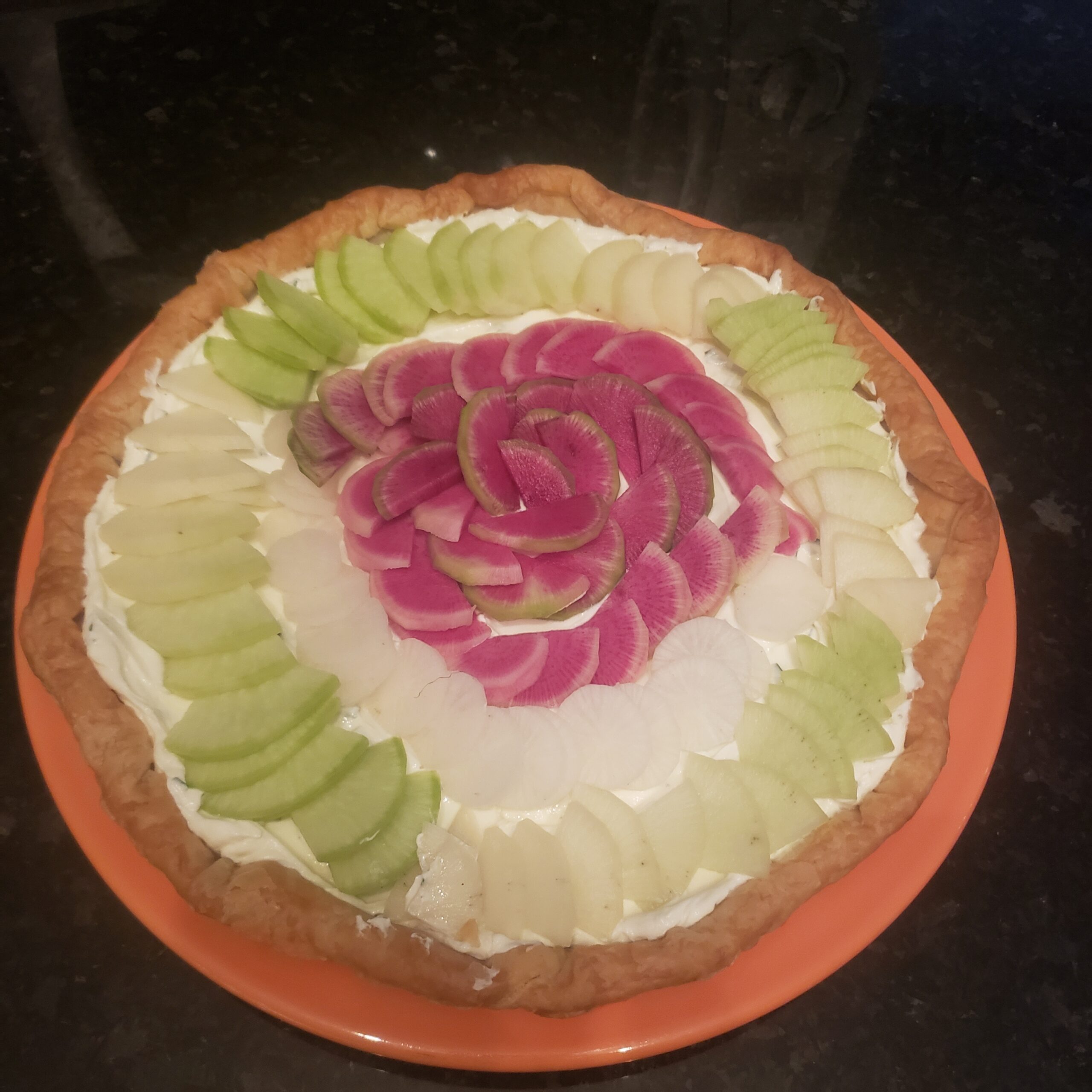 - Lavez et épluchez les radis, puis coupez-les en fines rondelles. Disposez-les harmonieusement sur la tarte, en une ou deux couches selon votre gourmandise.